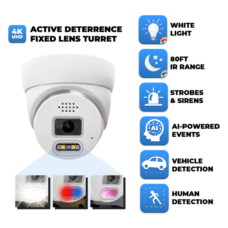 Cámara de seguridad IP tipo torreta resistente a la intemperie con disuasión activa Ultra HD 4K (8 MP) de la serie R con lente de 2,8 mm, luces estroboscópicas rojas y azules, luz blanca y sirena (M8T-DT)